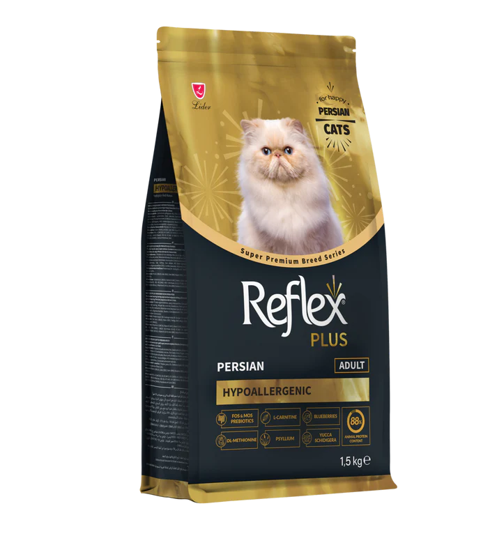 Reflex Plus Hypoallergenic Persian Cat Food is specially formulated for Persian cats with long hair and sensitive skin. Made with high-quality hypoallergenic proteins and enriched with omega fatty acids, it supports digestive comfort, a healthy coat, and optimal body condition. This balanced formula ensures complete nutrition for your cat’s unique breed needs.